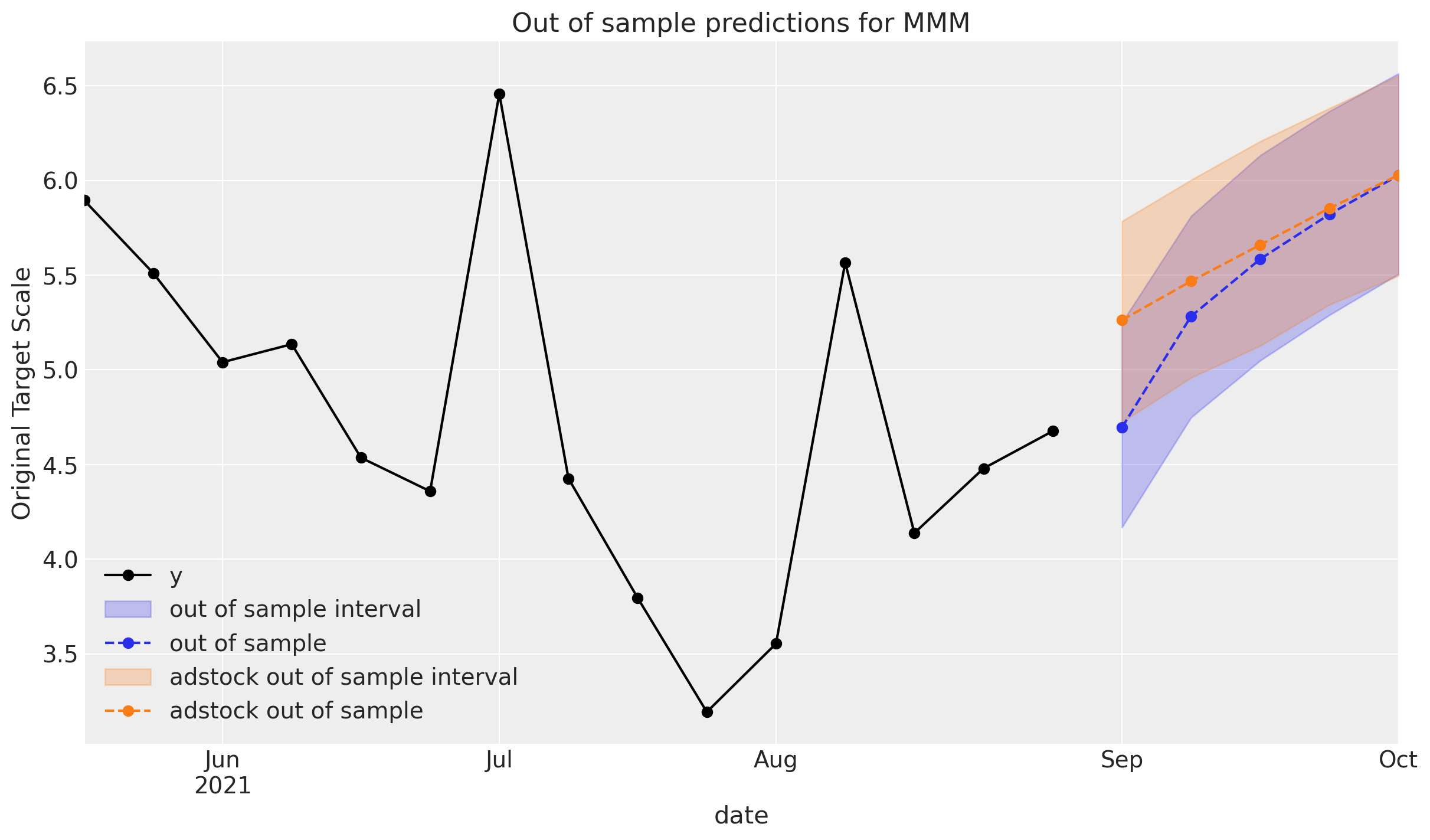 ax.set(ylabel="Original Target Scale", title="Out of sample predictions for MMM")